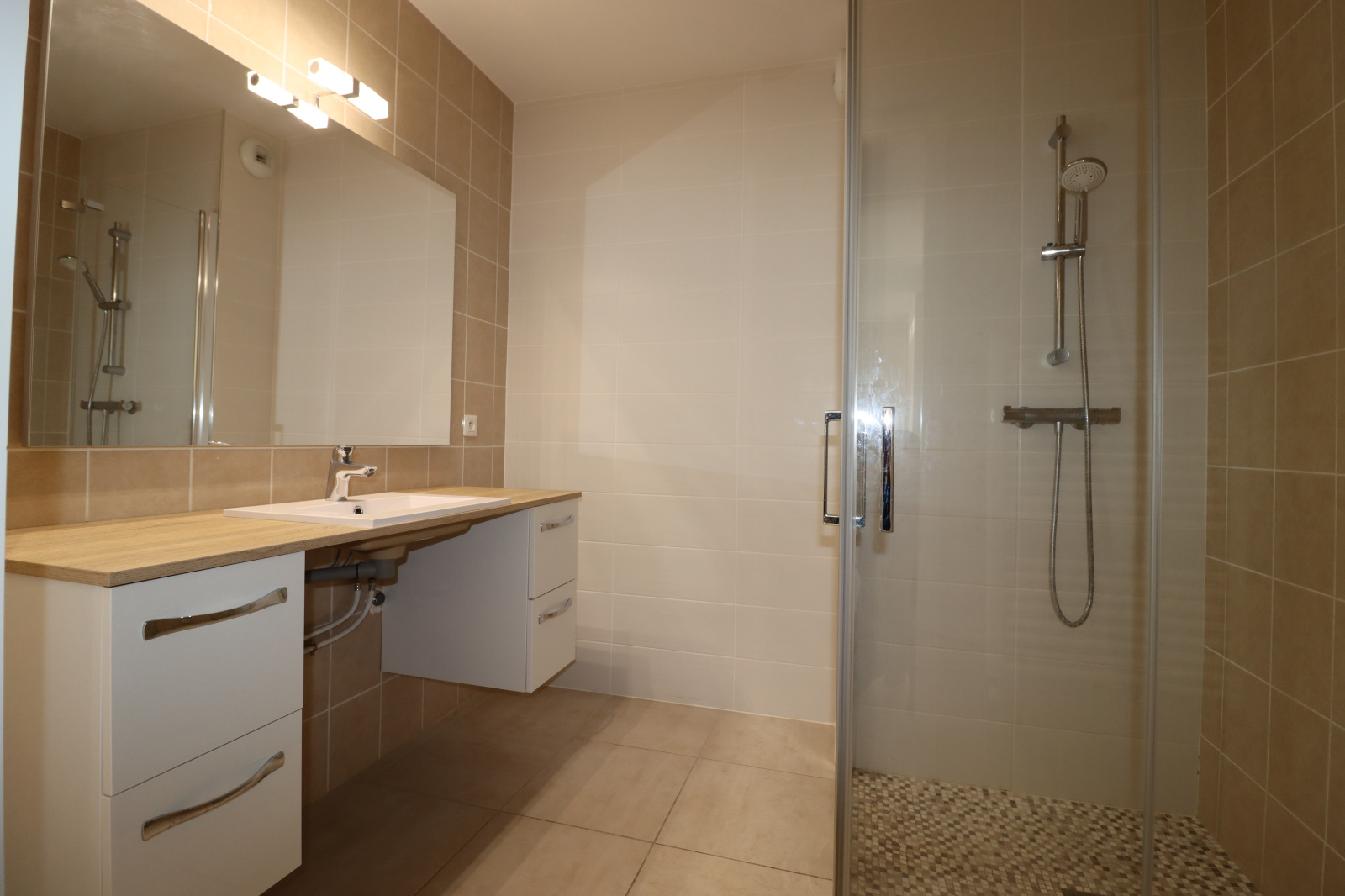 Une salle d'eau aménagée d'un meuble et d'une grande douche à l'italienne.